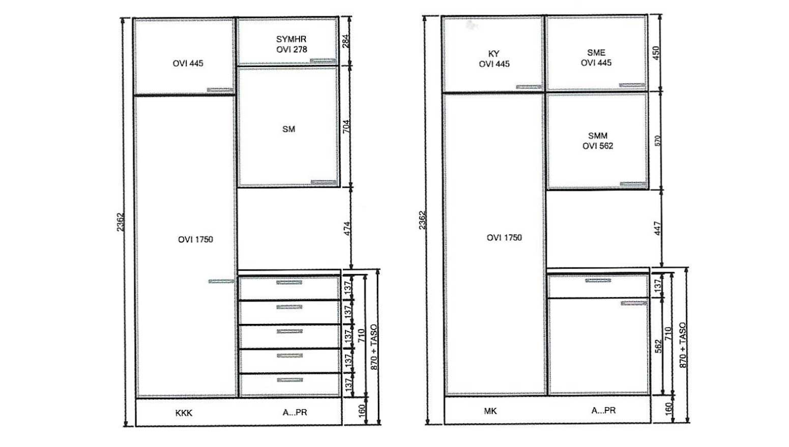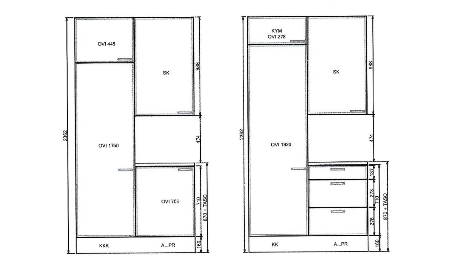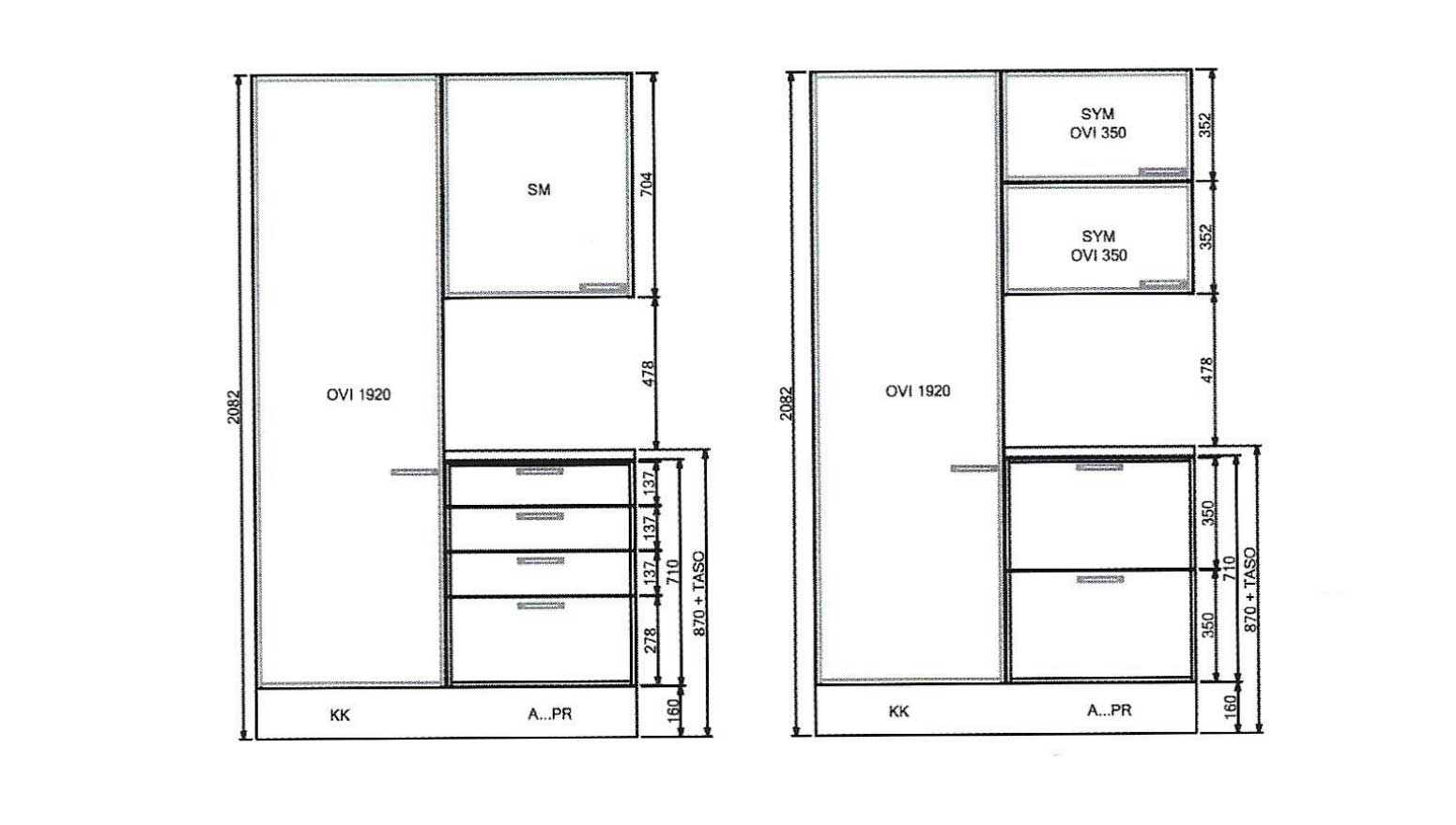 - Kaappien ovien eri korkeusmitat ja käyttökohteet näet alla olevista kuvista