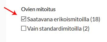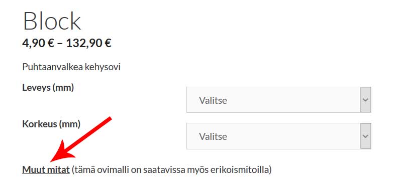 Useimpia verkkokauppamme kaapin ovimalleja on saatavissa myös vakiomitoista poikkeavilla mitoilla. Voit asettaa hakusuodattimeksi ehdon "Saatavana erikoismitoilla" (ks kuva), jolloin listautuvat vain ne kaapin ovimallit, joista on saatavissa myös erikoismittaisia kaapin ovia. Kaapin oven tuotesivulla näet linkin "Muut mitat...", josta pääset tilaamaan erikoismittaisia kaapin ovia.