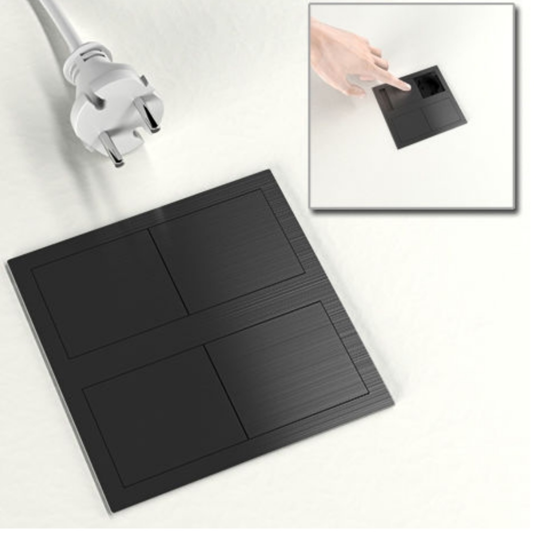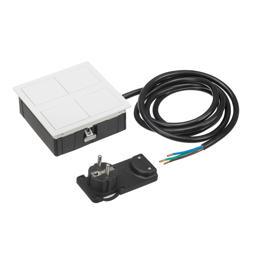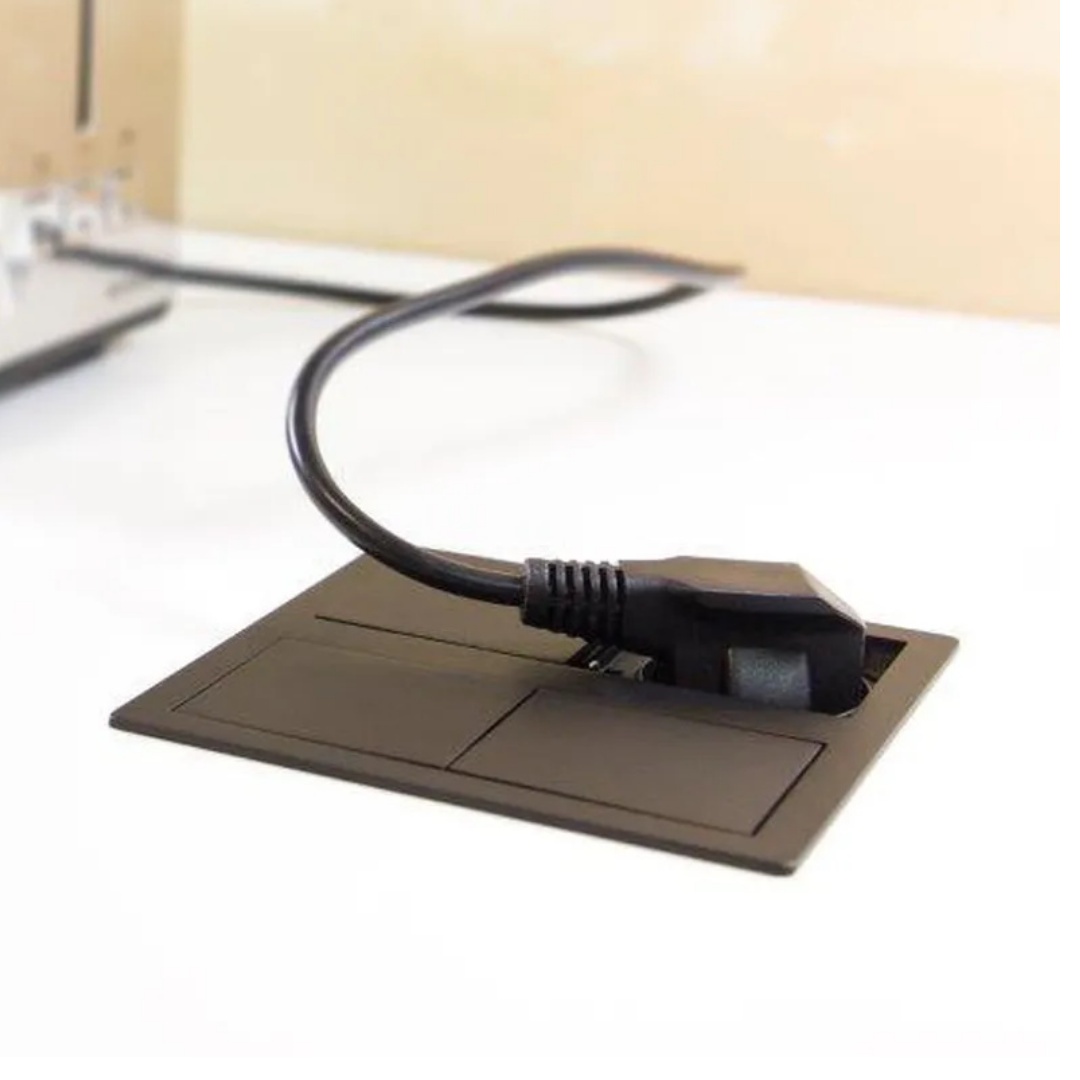 Kestävä metallinen liukukansi suojaa pistorasioita silloin, kun ne eivät ole käytössä, ja sulautuu siististi tasopintaan. Asennusta helpottaa valmiiksi asennettu 200 cm virtakaapeli maadoitetulla pistokkeella.