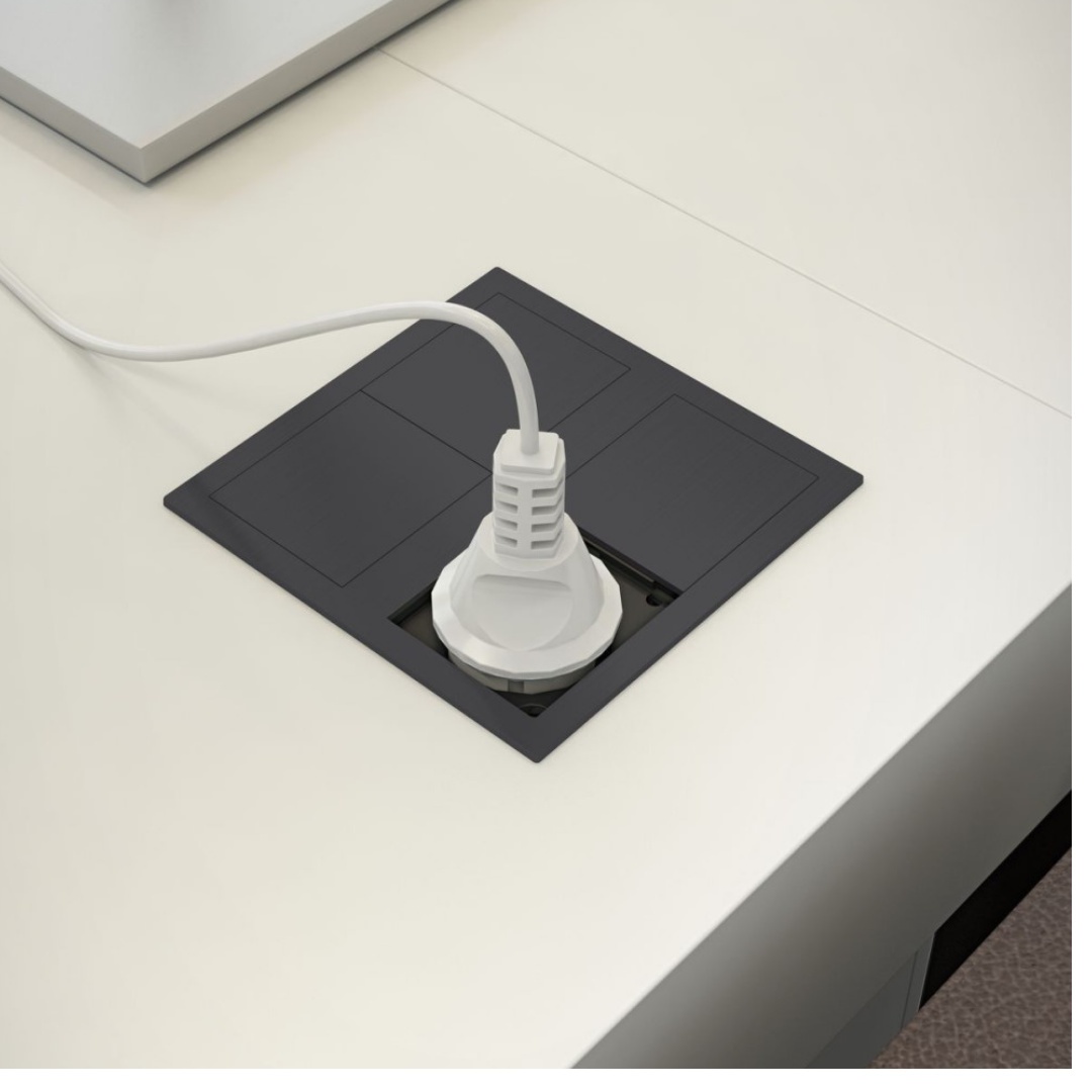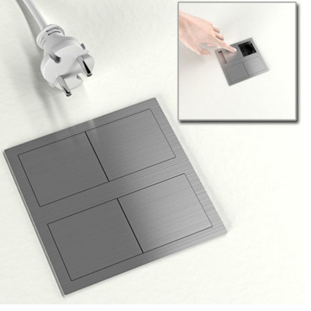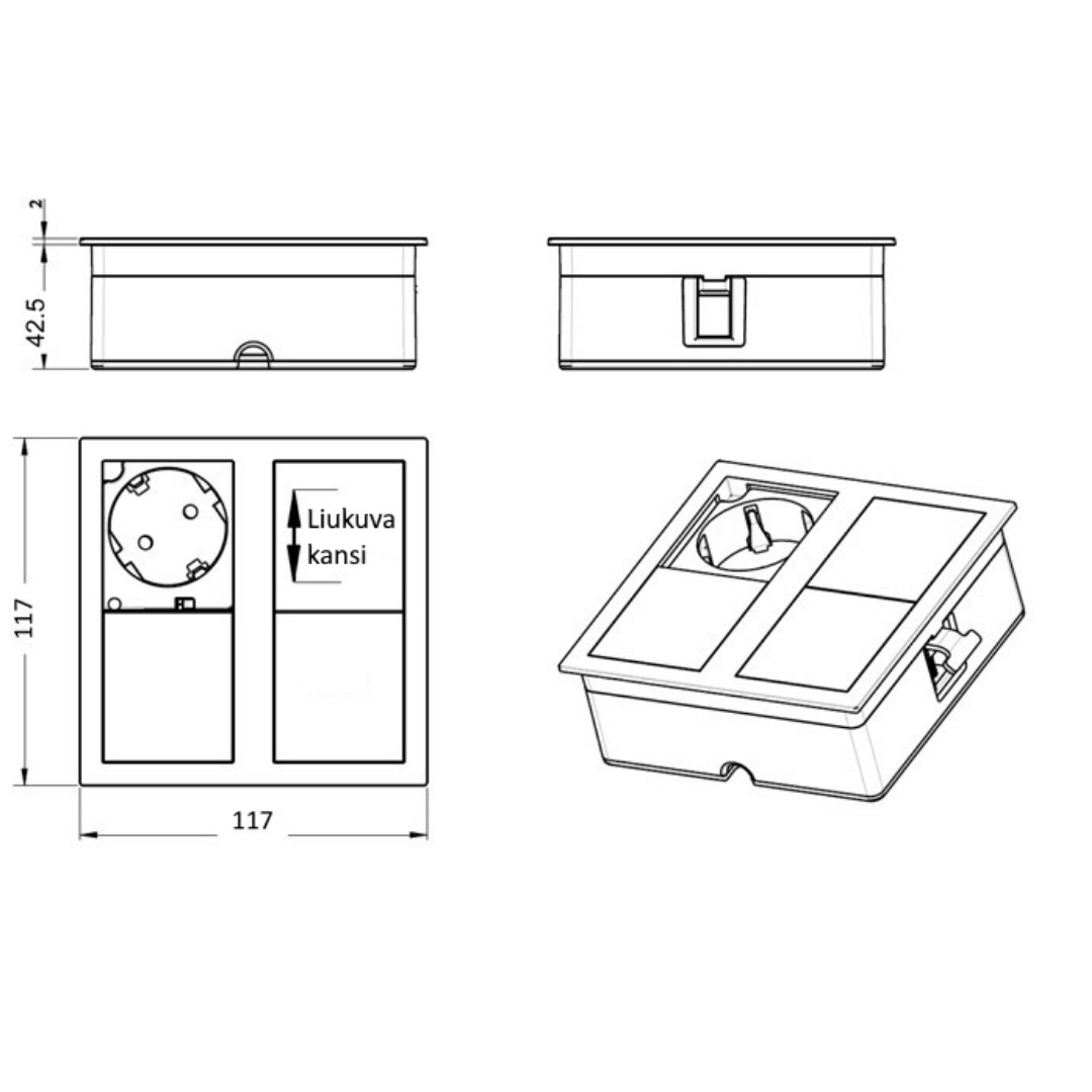 Kestävä metallinen liukukansi suojaa pistorasioita silloin, kun ne eivät ole käytössä, ja sulautuu siististi tasopintaan. Asennusta helpottaa valmiiksi asennettu 200 cm virtakaapeli maadoitetulla pistokkeella.