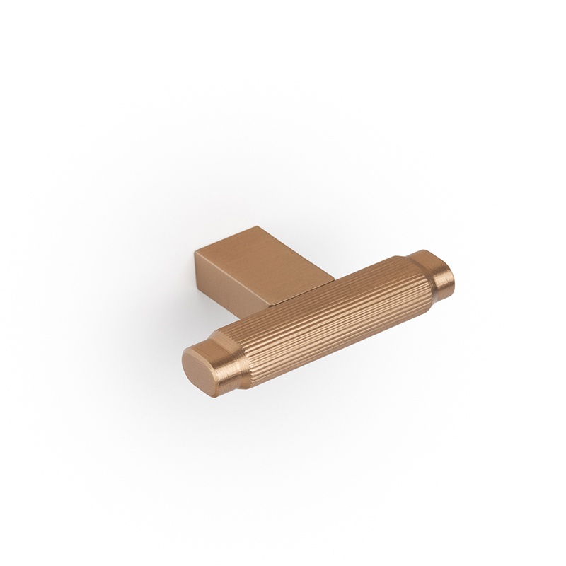 Uritettu T-nuppi Brooklyn, leveys 55 mm ja korkeus 37 mm. Materiaali alumiini. Väri harjattu pronssi.