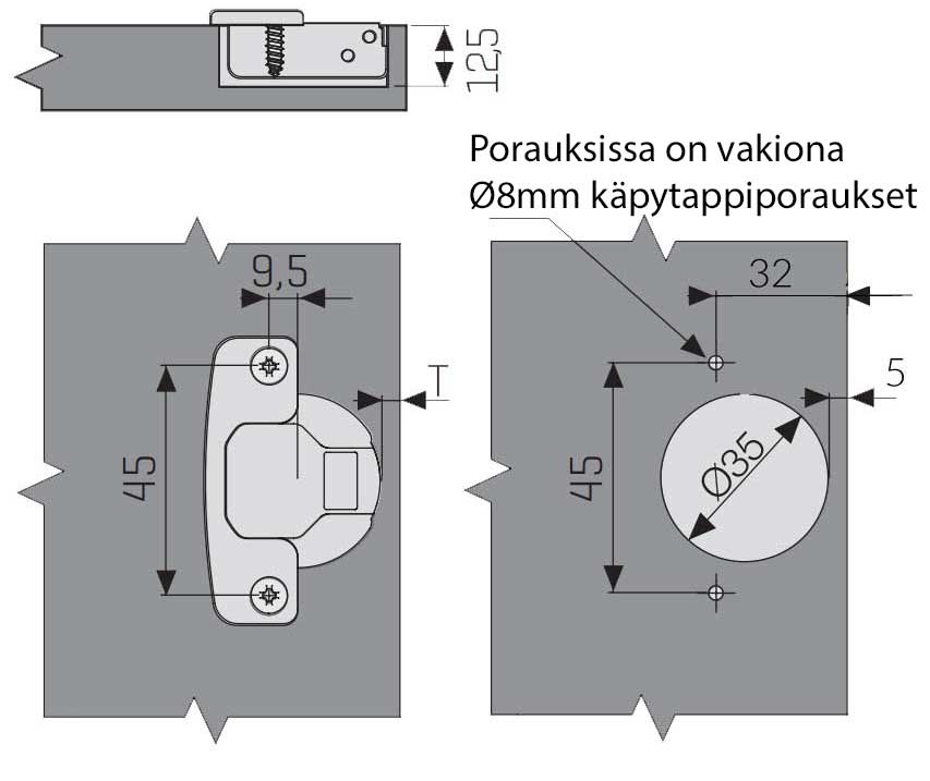 - kiinnitysruuvien etäisyys kaapin oven sivureunasta on 32mm